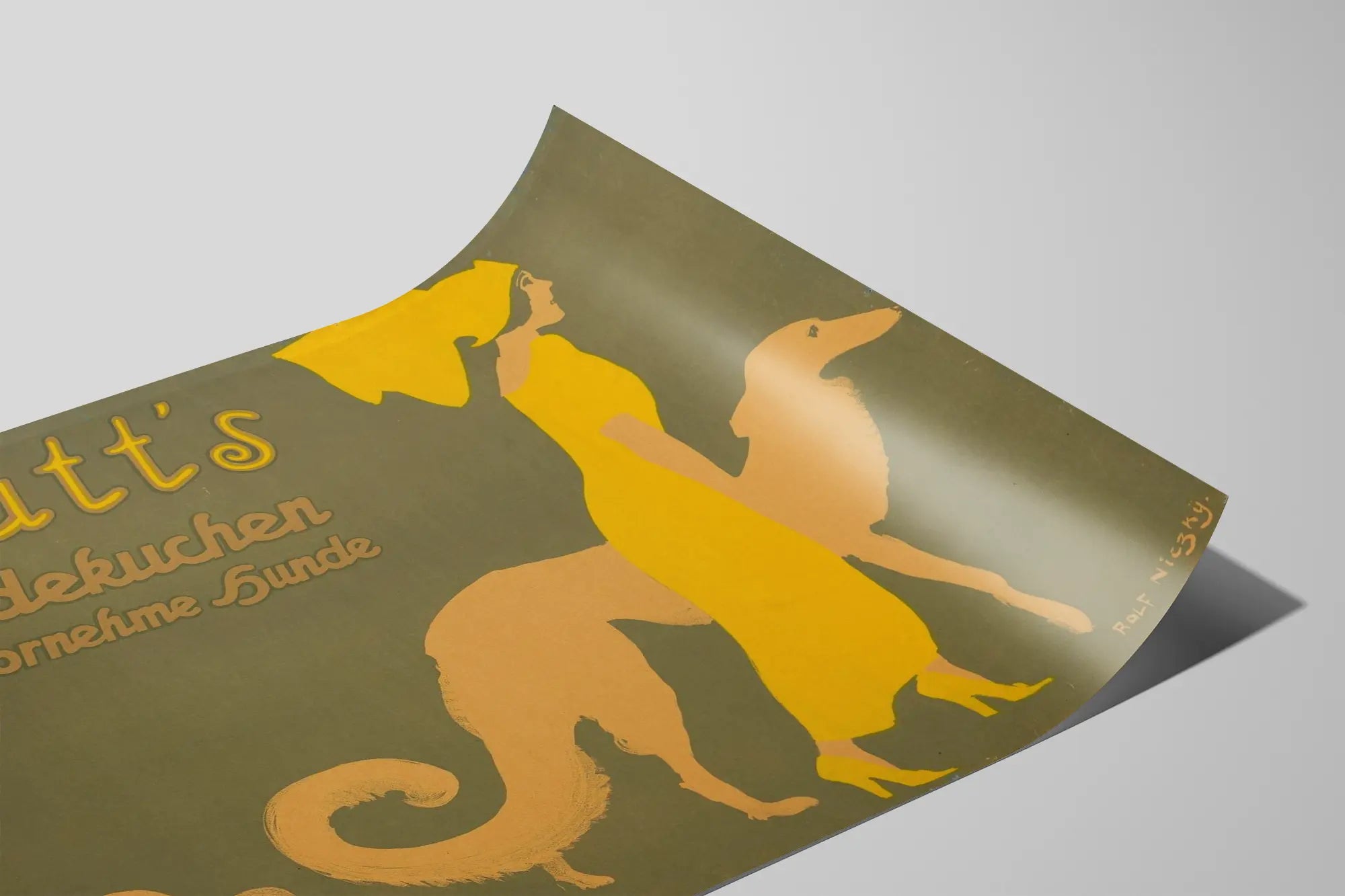 Dieses Vintage-Poster von Spratt's Hundekuchen zieht die Aufmerksamkeit durch sein schlichtes Design und seinen einzigartigen Retro-Ton auf sich, perfekt für eine originelle Wanddekoration. Auf einem khakifarbenen Hintergrund zeigt eine minimalistische und klare Grafik eine elegante Silhouette einer Frau in leuchtendem Gelb, begleitet von zwei stilisierten Hunden, die einen auffälligen Farbkontrast erzeugen. Die warmen Töne von Gelb und Beige treten kräftig gegen die Schlichtheit des Hintergrunds hervor. Der Text oben links, in einer Art-Déco-Schriftart geschrieben, verkündet „Spratt's Hundekuchen für vornehme Hunde“ und unterstreicht die elegante und raffinierte Atmosphäre des Posters. Diese ausgewogene Komposition aus menschlichen und hundlichen Elementen verleiht einen authentischen Retro-Charme, ideal für Liebhaber grafischer Kunst und alter Werbeplakate. An einer Wand im Wohnzimmer, Schlafzimmer oder Wartezimmer aufgehängt, verleiht dieses Poster jedem Raum eine markante und klassische Note. Es richtet sich sowohl an Sammler als auch an Design-Enthusiasten und Hundeliebhaber. Das Format und der Retro-Geist passen perfekt in moderne Innenräume, die ein ästhetisches und zugleich aussagekräftiges Wanddekor suchen. Gönnen Sie sich oder verschenken Sie dieses originelle visuelle Werbeobjekt, ein Symbol für einen eleganten und unkonventionellen Vintage-Stil.