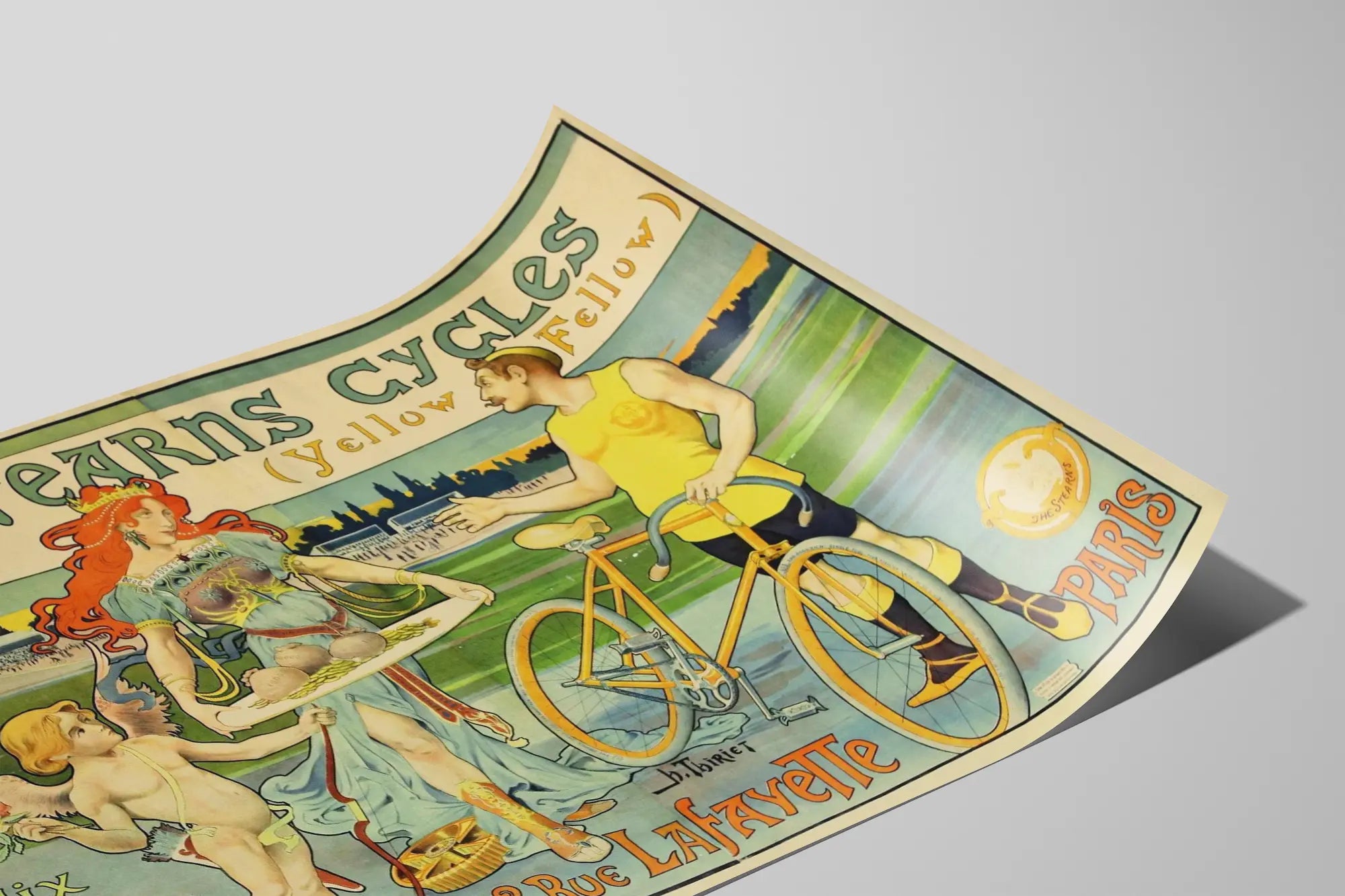 Der sorgfältig gestaltete grafische Stil, geprägt von sanften, harmonischen Farben sowie feinen, detaillierten Linien, folgt der Tradition der Werbeplakate des frühen 20. Jahrhunderts. Diese vintage Wanddekoration ist ideal für Fahrradliebhaber, Sammler alter Kunstwerke oder Kunstenthusiasten. Das Ganze wird durch kunstvoll kalligraphierte Texte bereichert: „Stearns Cycles (Yellow Fellow)“, „Félix Fournier und Knopf“ sowie die Adresse „103 Rue Lafayette, Paris“, die die Geschichte und Authentizität dieser Werbung unterstreichen.