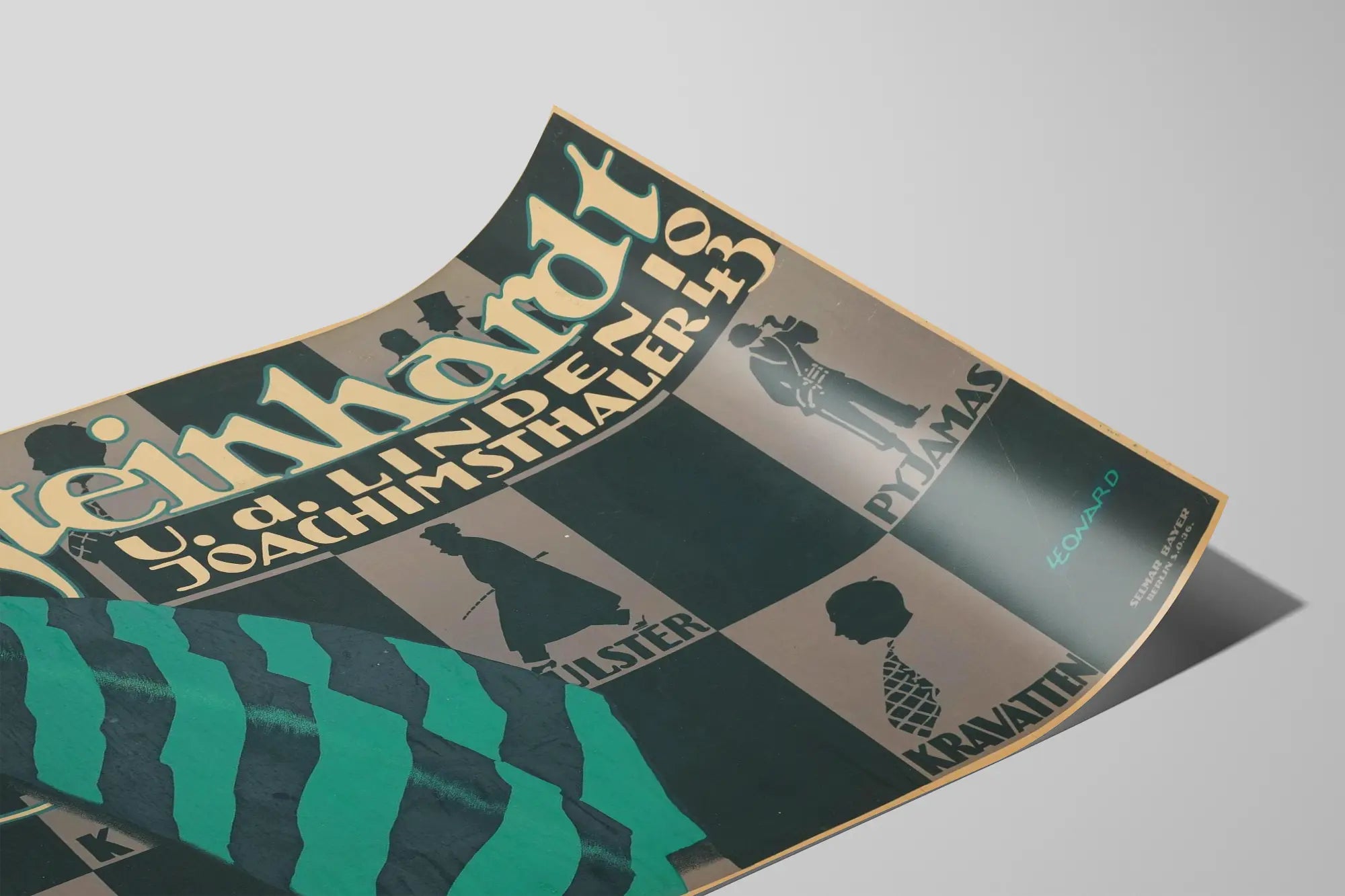Dieses vintage Plakat von Steinhardt ist ein originelles Wanddekorationselement, ideal für Liebhaber grafischer Kunst mit retroästhetischem Anspruch. Als Poster präsentiert, hebt es stilisierte Illustrationen hervor, die die männliche Mode darstellen, wie Hemden, Krawatten, Pyjamas und andere Kleidungsaccessoires. Das grafische Design spielt mit einem eleganten Kontrast aus dunklen Farben und grünen Tönen, was Ihrem Raum einen Hauch von Retro und Industriecharme verleiht. Die Schattenriss-Silhouetten und geometrischen Formen unterstreichen den einzigartigen Charakter dieses Posters, perfekt für eine schicke und authentische Wanddekoration. Dieses Bild im Stil der 1930er Jahre, signiert von 'Leonard' und in Berlin gedruckt, ist eine ausgezeichnete Wahl, um ein Büro, Wohnzimmer oder einen Lebensraum mit einem vintage und anspruchsvollen Akzent zu verschönern. Sein horizontaler Format ermöglicht eine einfache Integration in verschiedene Einrichtungsstile, sei es modern oder klassisch, für eine eindeutig männliche und elegante Atmosphäre. Die Schlichtheit der Silhouetten und das typografische Spiel tragen dazu bei, diese Wanddekoration zu einem charmanten und charaktervollen Kunstwerk zu machen, das besonders für Räume geeignet ist, die Mode oder Design gewidmet sind. Gönnen Sie sich dieses Steinhardt-Plakat für eine originelle Wandgestaltung, die zeitlose grafische Kunst mit einer stilvollen Atmosphäre verbindet.