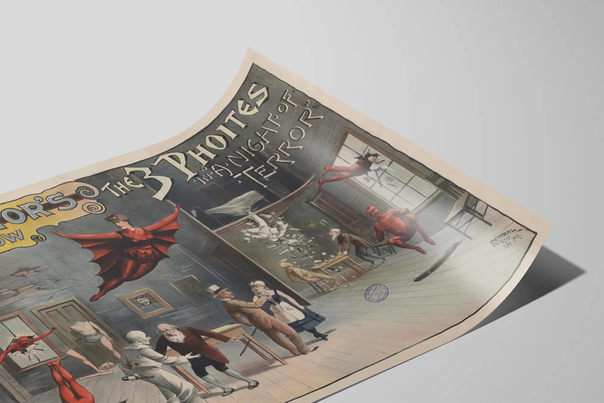 Dieses Vintage-Poster zeigt "Tony Pastor's Great Show" und seine Show mit dem Titel "The 3 Phoites in a Night of Terror", eine überraschende Bühneninszenierung. Dieses Plakat stellt eine Szene voller optischer Täuschungen und erstaunlicher visueller Effekte dar, in der Figuren zu schweben scheinen, durch Wände gehen oder in verschiedenen unmöglichen Positionen projiziert werden. Man sieht rote Figuren, die Dämonen ähneln, menschliche Silhouetten in verschiedenen faszinierenden Posen sowie eine Inneneinrichtung mit alten Möbeln und einem Rahmen, der an einen alten Theaterraum erinnert. Der grafische Stil und die Komposition regen die Fantasie an und schaffen eine Atmosphäre von Geheimnis und Spannung, perfekt für jeden Liebhaber von Retro-Postern oder origineller Wanddekoration mit theater- und fantastischem Thema. Dieses dekorative Plakat passt perfekt in eine Vintage-Wanddekoration und verleiht einem Wohnzimmer, einem Spielraum oder einem kreativen Bereich einen Hauch von Mystik und Geschichte. Die illustrative und farbenfrohe Gestaltung dieses Posters macht es zu einem einzigartigen Dekorationsstück, ideal, um eine Wand mit einem Gemälde oder Poster im alten Charme und illusionistischem Geist zu bereichern. Wählen Sie diese Wanddekoration, um eine fesselnde und überraschungsreiche Atmosphäre in Ihrem Zuhause zu schaffen.