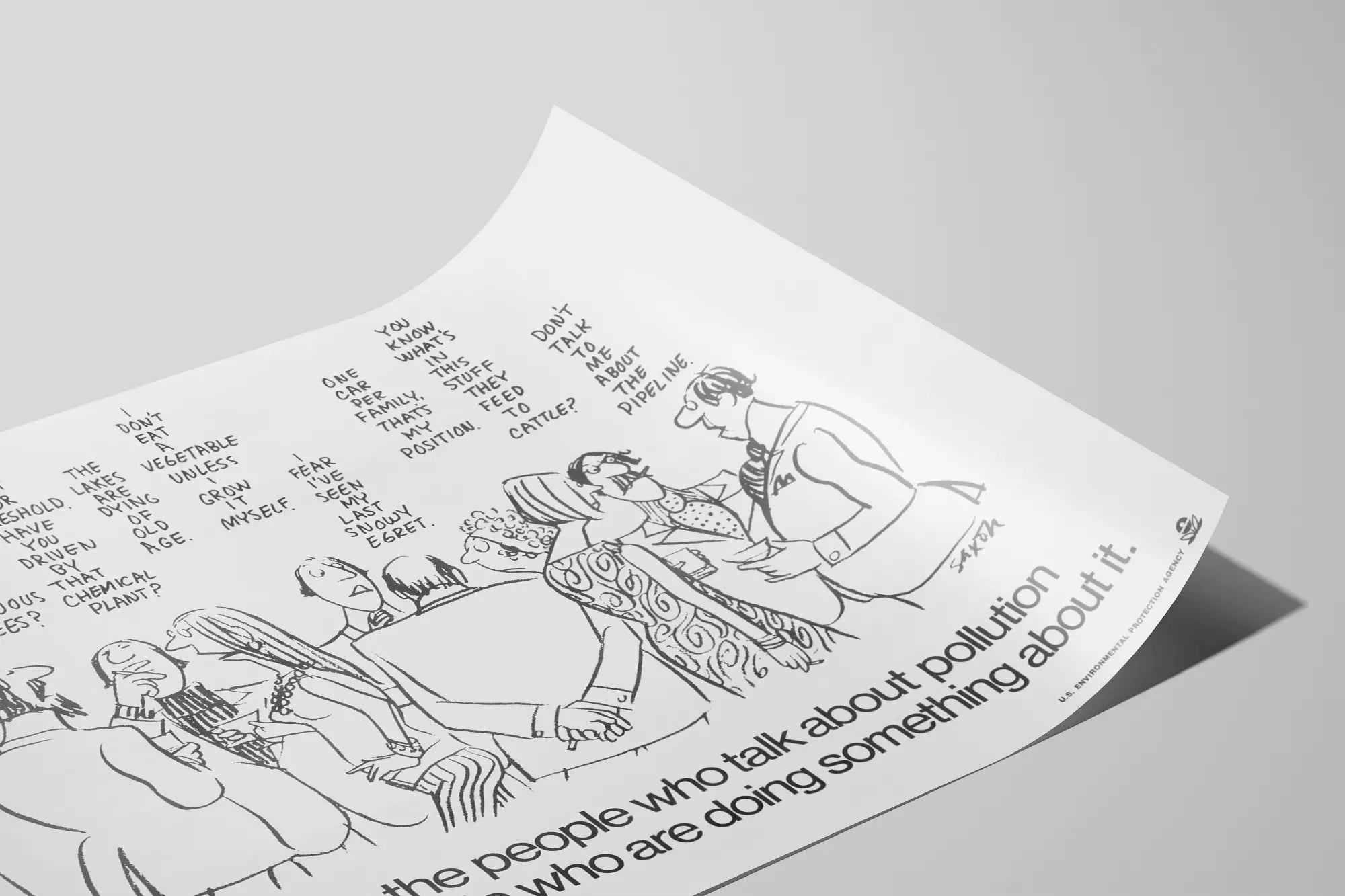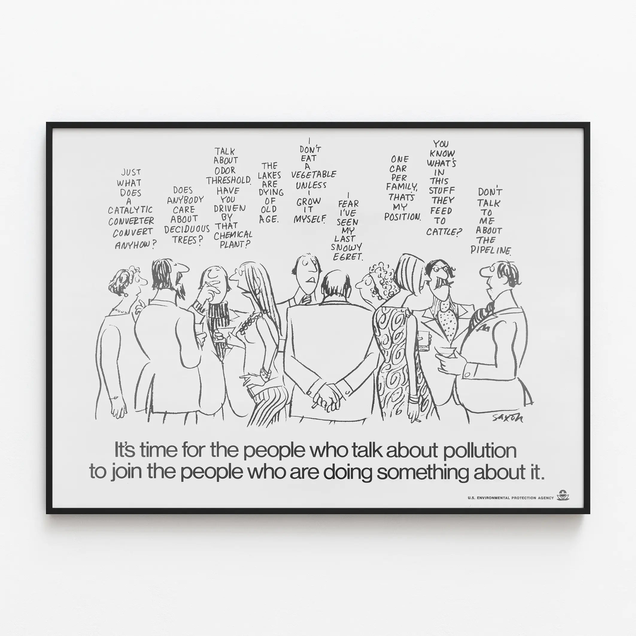 Dieses Vintage-Poster zur Sensibilisierung für Umweltverschmutzung der U.S. Environmental Protection Agency ist eine ausgezeichnete Wanddekoration für alle, die Umweltengagement und Retro-Stil verbinden möchten. Das schwarz-weiße Design zeigt eine Gruppe von Figuren im Comic-Stil, die über verschiedene Aspekte der Verschmutzung und Umweltfragen diskutieren und nachdenken, wie Katalysatoren, Laubbäume, Chemiefabriken, Luft- und Wasserqualität oder landwirtschaftliche Praktiken. Dieses Poster fordert dazu auf, von Worten Taten folgen zu lassen, mit einer klaren und engagierten Botschaft am unteren Rand: „Es ist Zeit, dass die Menschen, die über Verschmutzung sprechen, sich den Menschen anschließen, die etwas dagegen unternehmen.“ Es unterstreicht die Dringlichkeit, konkret gegen Umweltverschmutzung vorzugehen. Diese Wanddekoration ist ideal für ein Büro, einen Besprechungsraum oder einen Raum für Umweltbildung. Sie verleiht jedem Raum eine zugleich lehrreiche und ästhetische Note durch ihre einfache und ausdrucksstarke Zeichnung und vermittelt eine starke Botschaft über die Bedeutung kollektiver Verantwortung. Dieses Wandbild aus Papier, mit seinem klaren Grafikstil und seinem engagierten Inhalt, erfüllt perfekt die Bedürfnisse von Posterliebhabern mit thematischem Anspruch und Naturschützern, die ihre Wände mit bedeutungsvollen Bildern schmücken möchten.