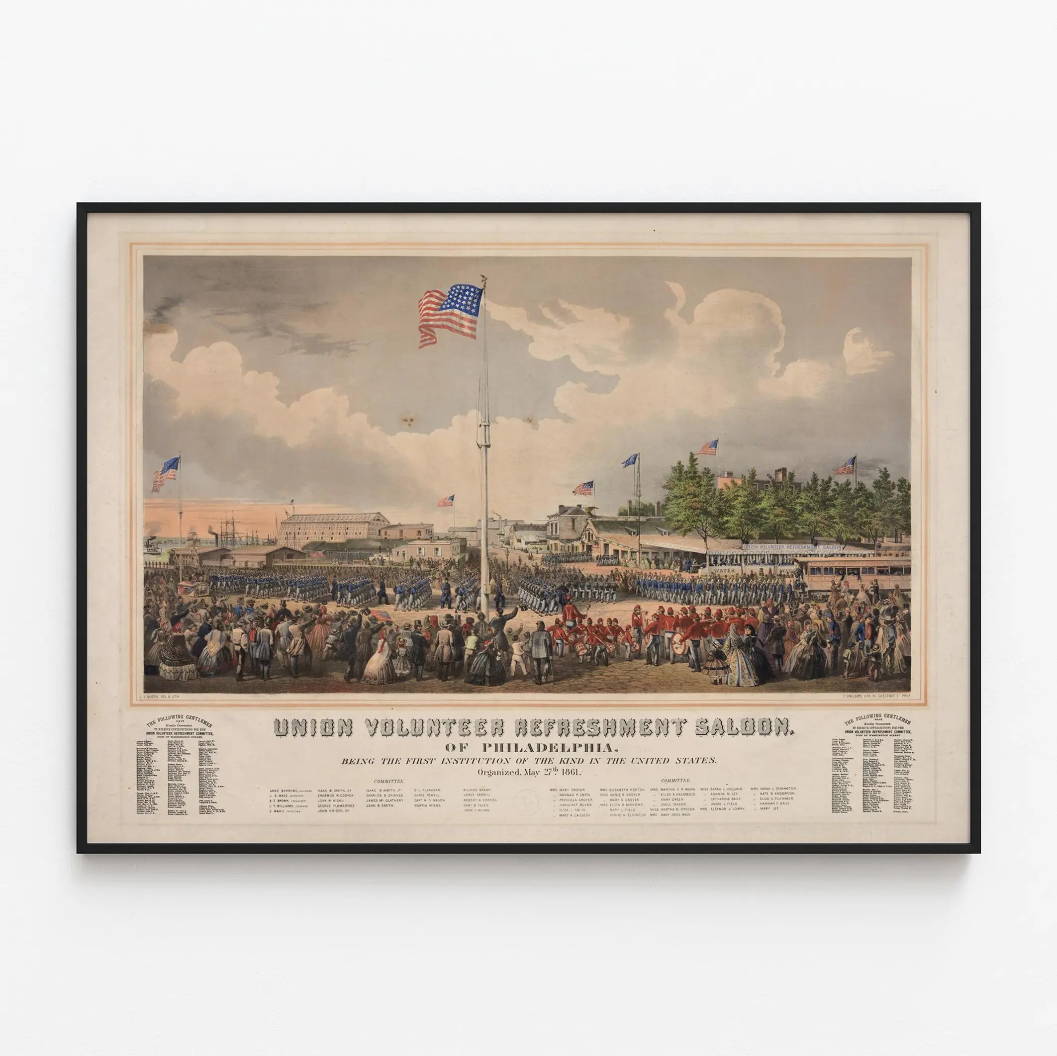 Dieses Vintage-Poster zeigt eine historische Szene, die in Philadelphia stattgefunden hat, und stellt den Union Volunteer Refreshment Saloon dar, einen ikonischen Ort der Aufnahme und Unterstützung für die Freiwilligen der Union während einer bedeutenden Phase der Vereinigten Staaten. Dieses Plakat ist ein einzigartiges Wanddekorationselement, das die Atmosphäre öffentlicher und militärischer Veranstaltungen widerspiegelt, mit einer großen Menschenmenge aus uniformierten Soldaten sowie zivilen Beobachtern verschiedener Herkunft, die die Szene betrachten. Die wehenden amerikanischen Flaggen verleihen dieser Illustration eine patriotische Note und bieten eine reiche Perspektive auf einen belebten Platz mit seinen Gebäuden und Feldmöbeln. Dieses lithografierte Bild ist zudem mit Namenslisten versehen, vermutlich der Organisatoren oder Mitwirkenden dieser Institution, was eine wertvolle historische Detailtiefe hinzufügt. Als Poster ist es ideal für Liebhaber amerikanischer Geschichte und Vintage-Wanddekorationen, die ein bedeutungsvolles und authentisches Element in ihre Räume integrieren möchten. Dieses Wandkunstwerk findet seinen Platz im Wohnzimmer, im Büro oder in einer Bibliothek und verleiht dem Raum einen Hauch historischer Eleganz sowie eine Atmosphäre vergangener Zeiten. Seine farbige und präzise Wiedergabe macht es zu einem ansprechenden Poster, das Ästhetik und gemeinsames Gedächtnis verbindet – perfekt, um einen Raum durch seine visuelle Erzählung und seinen Retro-Charme zu bereichern.