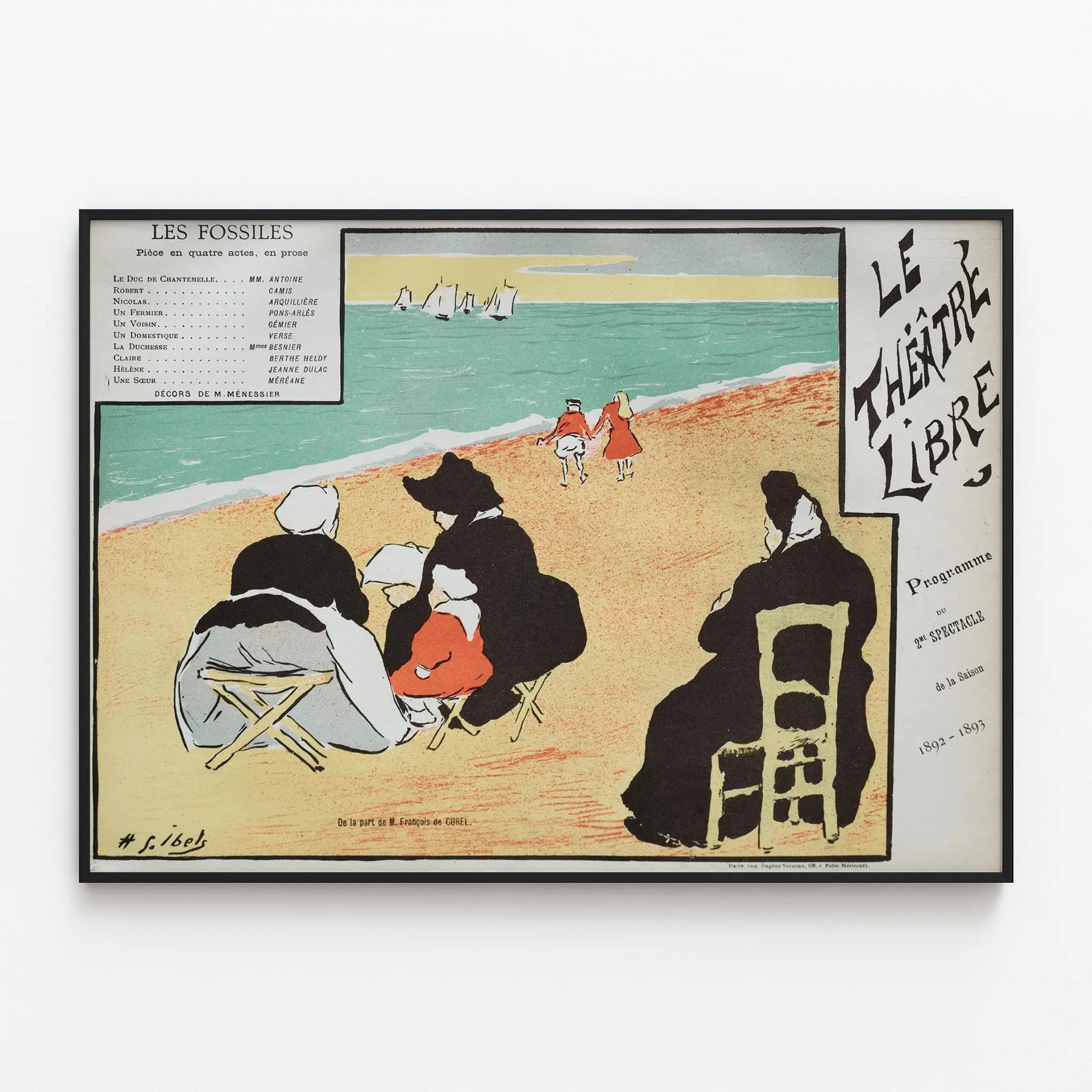 Bringen Sie einen Hauch von Eleganz und Authentizität in Ihre Wanddekoration mit diesem Vintage-Poster mit dem Titel „Les Fossiles“, das vom Théâtre Libre stammt. Dieses illustrierte Plakat zeigt eine faszinierende Szene am Meer, die dunkle Silhouetten sitzender Figuren mit einem lebhaften Strand im Hintergrund verbindet, akzentuiert durch Pastellfarben wie Blau, sanften Sand und Rot. Das Werk ist signiert und hebt das Programm eines vieraktigen Stücks hervor, schlicht und zurückhaltend, ergänzt durch eine alte Typografie, die den Geist des klassischen Theaters unterstreicht.
