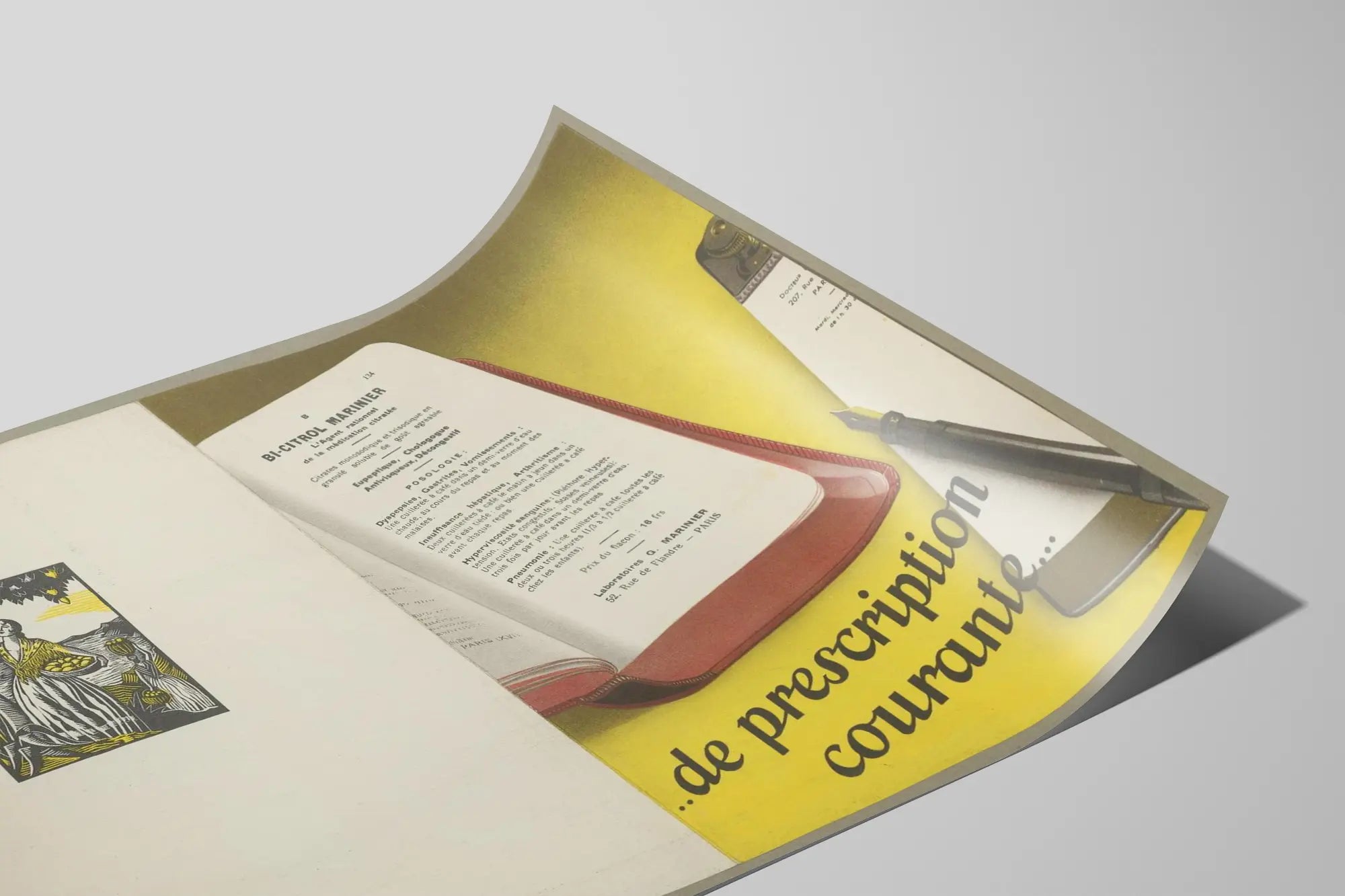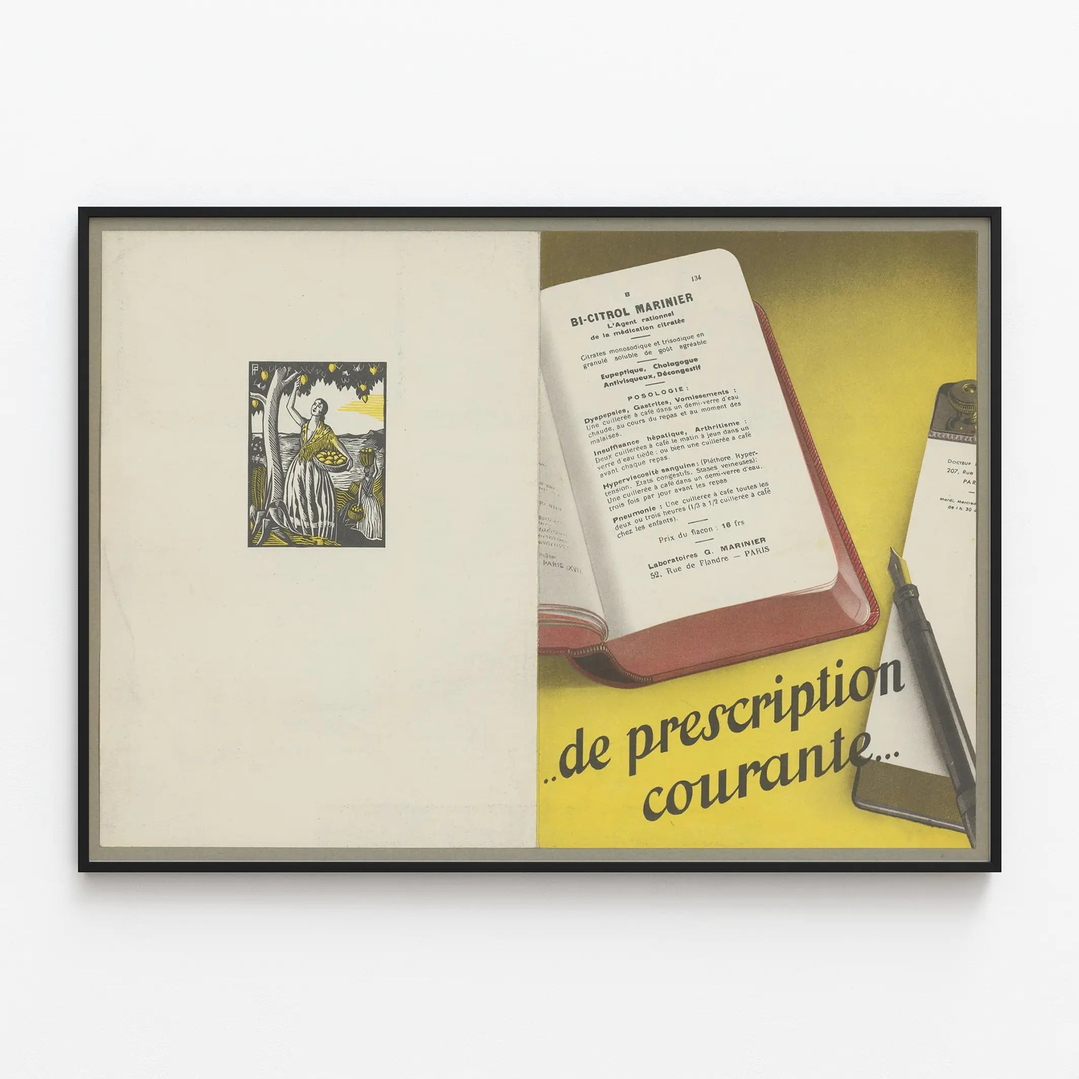 Entdecken Sie dieses Vintage-Poster, das das Medikament Bi-Citrol Marinier hervorhebt, ein lösliches Granulat auf Basis von Monosodium- und Trisodiumcitraten, präsentiert als ein rationales Mittel der citratbasierten Medizin. Diese historische Wanddekoration zeigt ein geöffnetes Handbuch mit einer detaillierten Dosierung, begleitet von einem Füllfederhalter und einem medizinischen Siegel, vor einem leuchtend gelben Hintergrund, der Dynamik und Wärme verleiht. Perfekt für Liebhaber retro Wanddekoration oder Sammler medizinischer Werbeplakate aus der Mitte des 20. Jahrhunderts, besticht dieses Stück durch eine elegante Typografie und ein authentisches Design. Als gängiges Rezeptposter schafft es eine Atmosphäre, die sowohl historisch als auch grafisch ist, und bereichert Ihr Zuhause. Dieses Werbeplakat, das auf antiepileptische, choleretische, antivirale und abschwellende Wirkungen hinweist, kann als Blickfang in einer Behandlungsraum, einer Arztpraxis oder einem Raum im Vintage-Stil dienen. Sein schlichter und klarer Stil, der deutlichen Text mit grafischen Elementen verbindet, macht es auch zu einem dekorativen Plakat, das sich für moderne Umgebungen eignet, die einen Hauch von Authentizität und Charakter suchen. Dieses hochwertige Poster hebt ein historisches Arzneimittel hervor und bietet gleichzeitig eine retro-chice Ästhetik, die in Wanddekorationen geschätzt wird. Verschönern Sie Ihre Wände mit diesem Bi-Citrol Marinier-Poster, Symbol einer Zeit, in der Werbung sich mit Wandkunst verband, um auf elegante und schlichte Weise zu informieren.