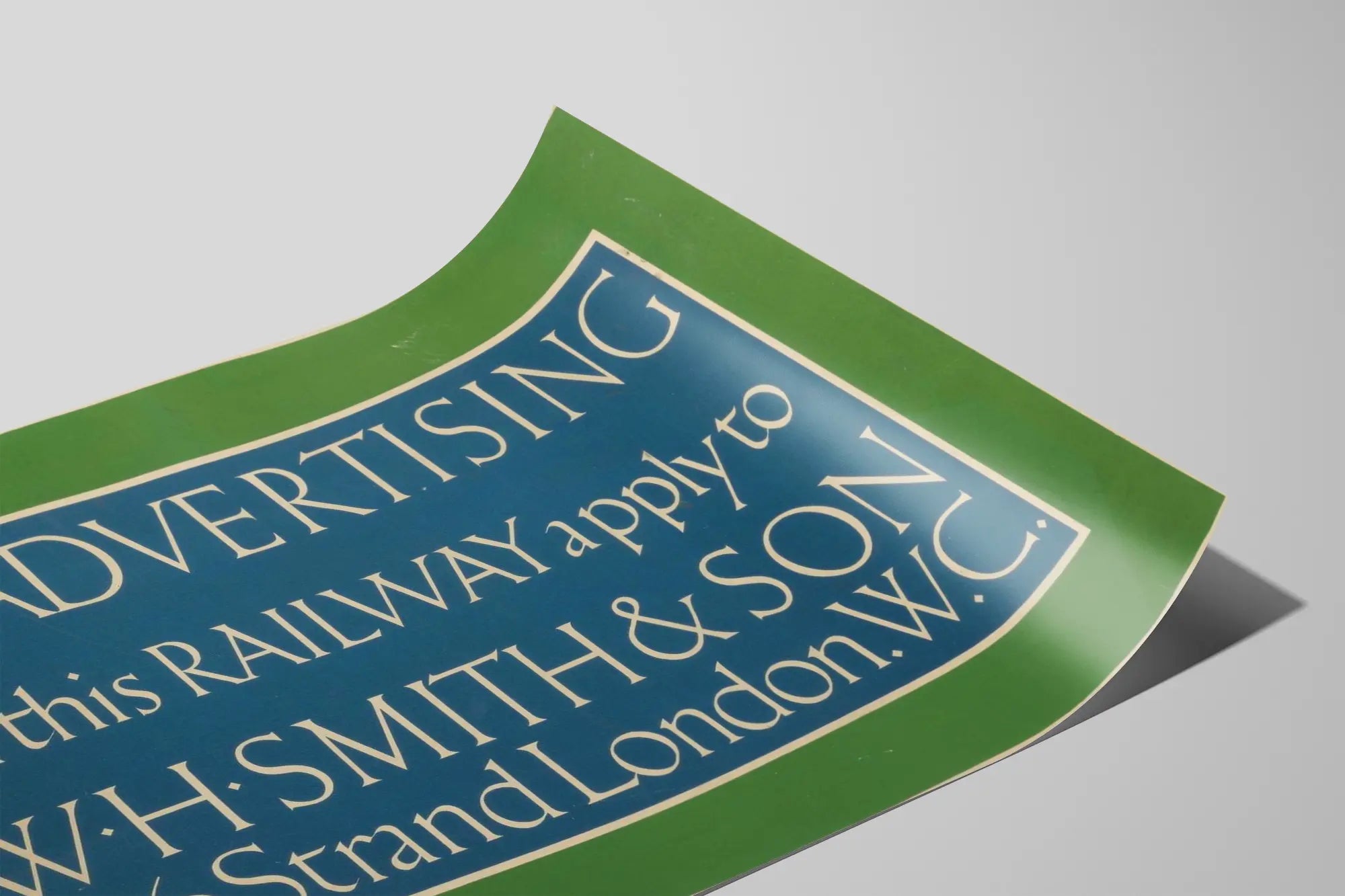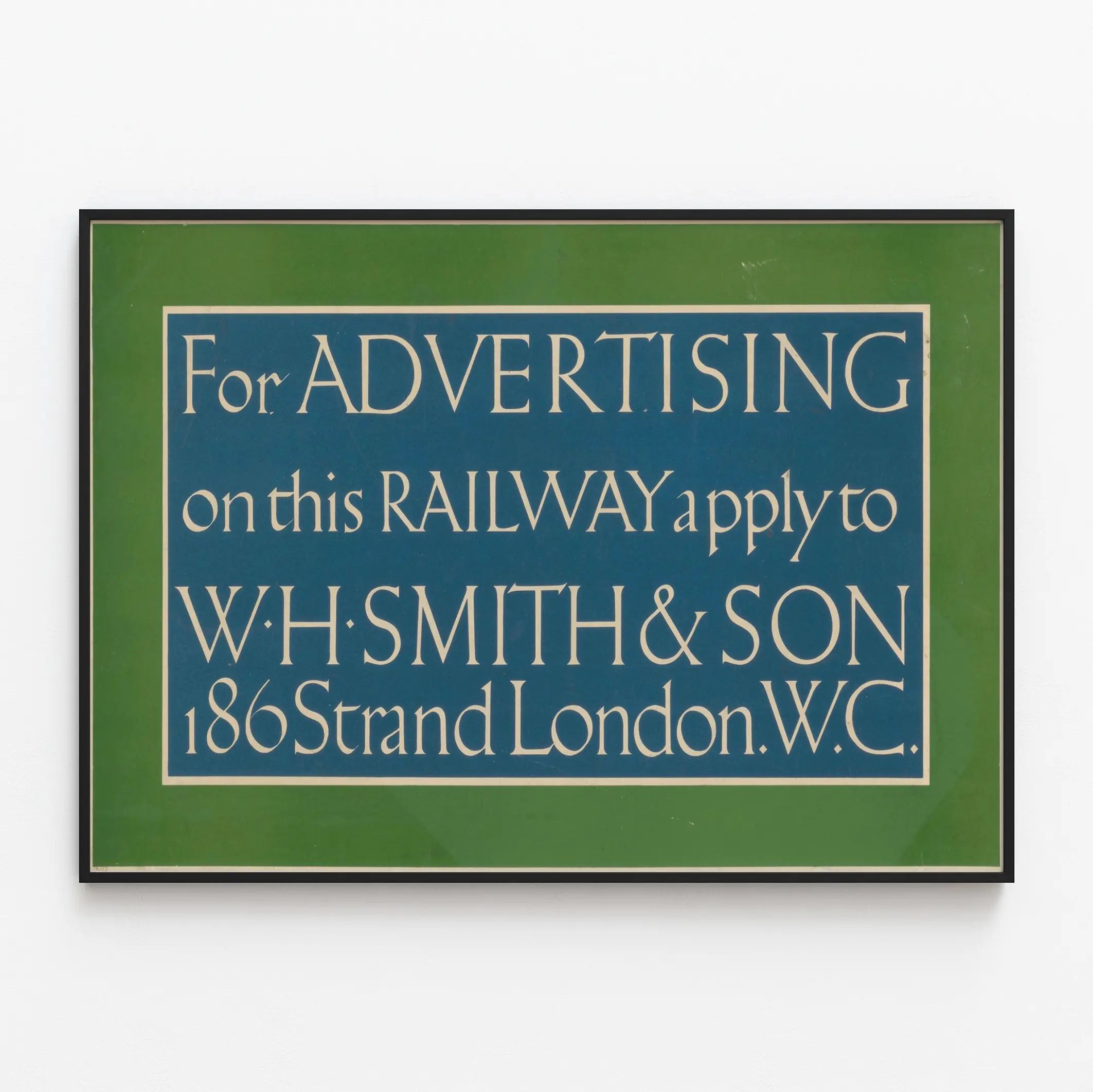 Entdecken Sie dieses originale Vintage-Poster, das für die Eisenbahnwerbung bestimmt ist, ein beeindruckendes Beispiel für Wanddekoration mit historischen Akzenten. Dieses Plakat hebt eine elegante und sorgfältige Typografie auf einem zweifarbigen Hintergrund in Grün und Blau hervor, perfekt, um Ihrem Interieur einen Retro-Touch zu verleihen. Die Aufschrift lädt dazu ein, Werbeanfragen an W.H.. Smith & Son zu richten, mit einer genauen Adresse im 186 Strand, London W.C., was die Bedeutung der kommerziellen Kommunikation auf Eisenbahnstrecken in vergangener Zeit unterstreicht. Dieses Werbeplakat passt perfekt in eine Sammlung alter Poster oder in eine thematische Wanddekoration, sei es für Transport, Werbung oder Geschichte. Sein schlichter und direkter Stil, mit einem sehr gut lesbaren Layout, macht es zu einem dekorativen Element, das den Blick fesselt und gleichzeitig eine einzigartige Authentizität vermittelt. Ideal für Liebhaber alten Grafikdesigns oder zur Bereicherung einer Vintage-Atmosphäre, zeichnet sich dieses Poster durch die klare Hervorhebung des Textes und seinen grünen Rahmen aus, der ein tiefblaues Schild umgibt und einen harmonischen visuellen Kontrast schafft. Präsentieren Sie dieses Plakat in einem Wohnzimmer, Büro oder Geschäftsraum für eine charaktervolle Atmosphäre, die den Charme alter Bahnwerbungen evoziert.