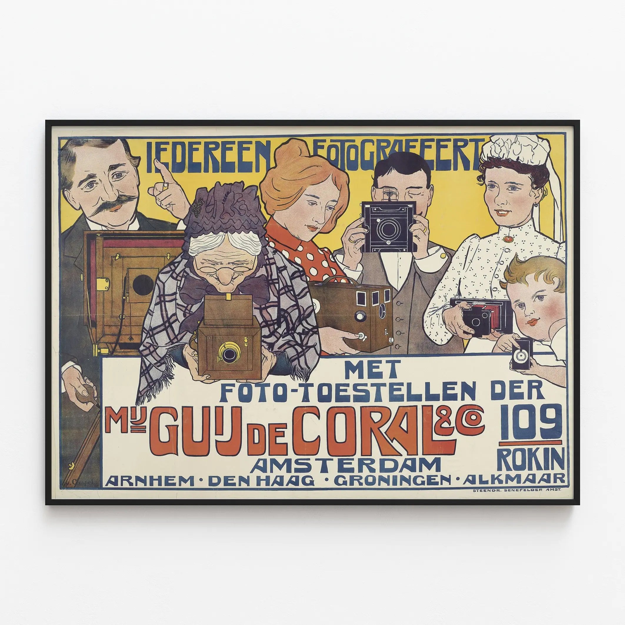 Dieses vintage Poster mit einzigartigem Design ist ein echtes Wanddekorationstück für Liebhaber der Fotogeschichte und Vintage-Enthusiasten. Es zeigt mehrere Figuren verschiedener Generationen, die jeweils eine alte Kamera halten und somit die Demokratisierung der Fotografie illustrieren, begleitet vom Slogan „Iedereen Fotografeert“, was „Jeder ist Fotograf“ bedeutet. Dieses niederländischsprachige Werbe-Poster ist ideal, um Ihrem Zuhause einen retro-inspirierten und authentischen Akzent zu verleihen. Es zeigt die Vielfalt der Formate und Modelle alter Kameras, vom ältesten bis zum modernsten, und bietet einen faszinierenden Einblick in die technologische und kulturelle Entwicklung der Fotografie. Ob Poster oder Wandbild, diese Wanddekoration ist perfekt für Wohnzimmer, Büros oder Fotostudios und verleiht einen nostalgischen Charme mit einer universellen Botschaft: Fotografie ist für alle zugänglich. Sein grafischer Stil und seine lebendigen Farben ziehen den Blick auf sich und machen dieses Poster zu einem originellen und inspirierenden Wandbild. Schmücken Sie Ihre Wände mit diesem retro-inspirierten, künstlerischen Poster, das die Fotografie als Kunstform für jedermann wertschätzt und gleichzeitig die historischen Wurzeln alter Kameras sowie ihre Bedeutung in der Popkultur erinnert.