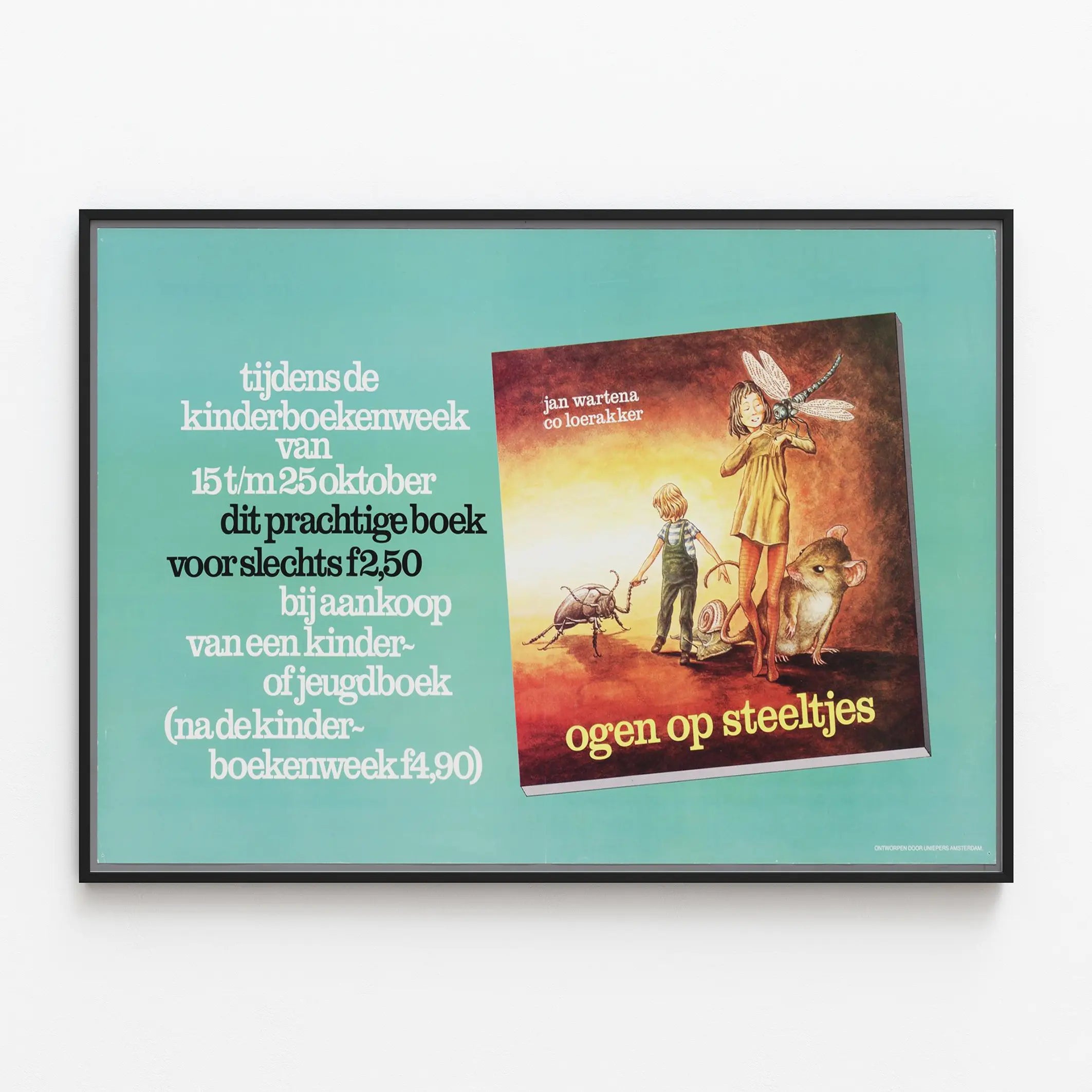 Dieses Vintage-Poster stammt vermutlich aus einer Werbekampagne für die Kinderboekenweek, eine Woche, die den Büchern für Kinder und Jugendliche gewidmet ist und vom 15. bis 25. Oktober stattfand. Das Plakat lenkt die Aufmerksamkeit auf ein illustriertes Buch mit dem Titel "ogen op steeltjes", das eine farbenfrohe Darstellung warmer Töne zeigt und Kinder in Gesellschaft von Tieren wie einer Libelle, einem Käfer, einer Schnecke und einer Maus darstellt. Der niederländische Text gibt an, dass dieses wunderschöne Buch während der Kinderboekenweek zu einem Sonderpreis von 2,50 Gulden beim Kauf eines Buches für Kinder oder Jugendliche angeboten wurde, danach zu einem niedrigeren Preis von 4,90 Gulden nach Ablauf dieser Woche. Das Plakat ist ein schönes Beispiel für Retro-Wanddekoration, ideal für Liebhaber der Jugendliteratur oder zur Erweiterung einer Sammlung von Kampagnenplakaten. Es hebt die Wertschätzung für Kinderbücher durch eine farbenfrohe und nostalgische Ästhetik hervor. Dieses Poster lässt sich harmonisch in ein Interieur integrieren, beispielsweise als einzigartiges Wanddekorationselement, das sowohl einen Vintage-Touch als auch eine Hommage an die Kinderbuchkultur bietet. Perfekt für ein Kinderzimmer, eine Bibliothek oder einen Lesebereich. Dieses Plakat lädt dazu ein, die fantasievolle Welt der Kinder mit ihren Kreaturen und ihrer warmen Atmosphäre neu zu entdecken. Es ist ein authentisches Stück, das Liebhaber von Wanddekorationen und literarischen Themenplakaten begeistern wird.