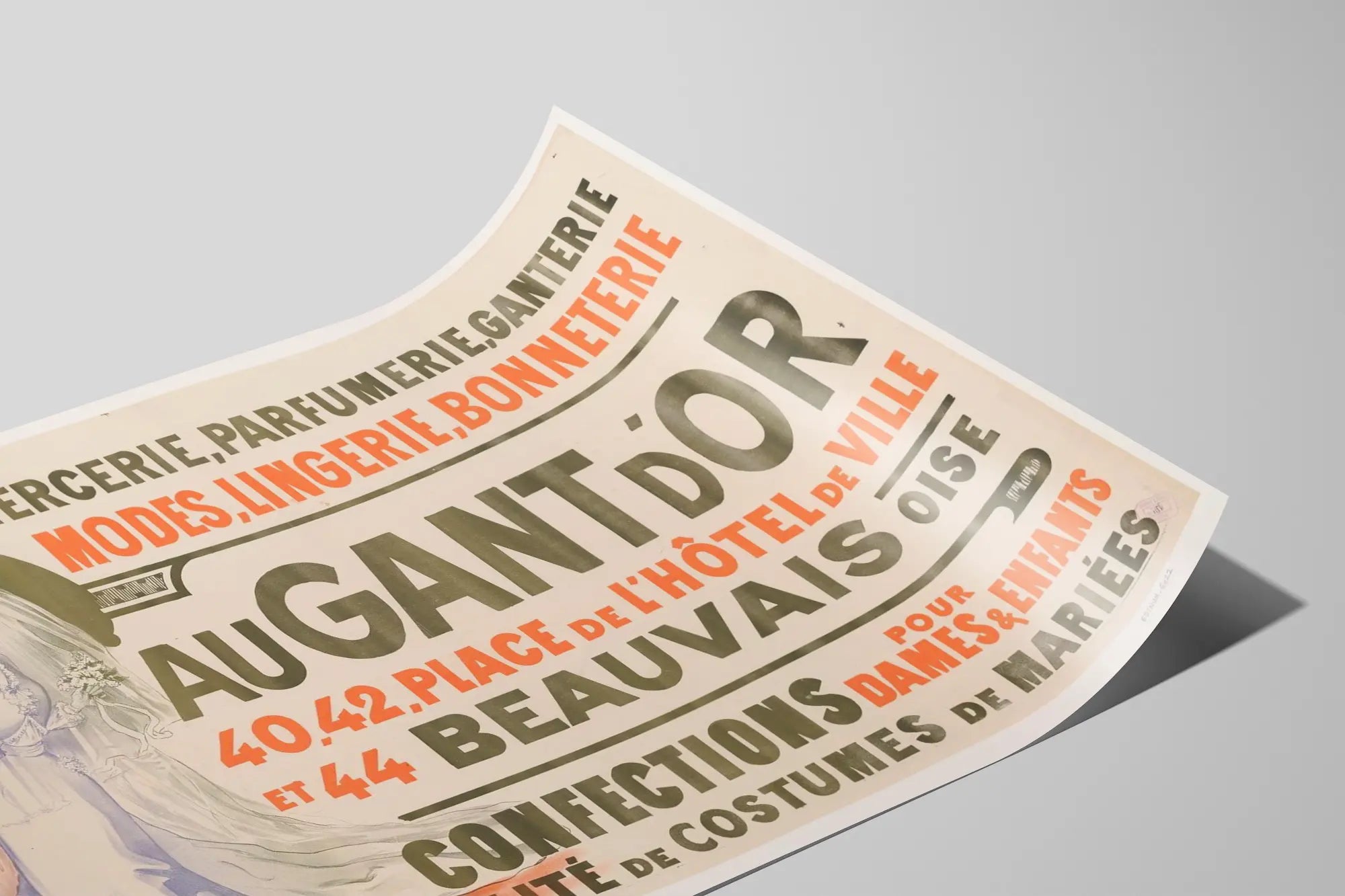 Dieses vintage Werbeplakat hebt ein Geschäft hervor, das auf Kurzwaren, Parfümerie, Handschuhwaren, Mode, Dessous und Strümpfe spezialisiert ist, gelegen in Beauvais, Oise. Mit einem starken typografischen Design und einer eleganten Illustration zeigt es eine Braut in einem traditionellen weißen Kleid mit Schleier, die einen Blumenstrauß hält, und unterstreicht die Spezialität des Geschäfts im Bereich Brautkleider. Der große Schriftzug zieht die Aufmerksamkeit auf das Schild „Zum Goldenen Handschuh“ und die genaue Adresse des Ladens, Place de l'Hôtel de Ville, ein interessantes Detail für eine Wanddekoration mit nostalgischem Charme. Dieses Plakat ist eine ideale Wahl für Wanddekorationen für Liebhaber des Vintage-Stils und einer Welt, die Mode, Schneiderei und Tradition verbindet. Perfekt für ein Interieur mit nostalgischer Atmosphäre bringt es einen Hauch visueller Geschichte und evoziert Eleganz sowie Handwerkskunst rund um Textilherstellung und Modeaccessoires. Dieses dekorative Poster findet seinen Platz sowohl im Wohnzimmer, in einer Schneiderei, als auch in einem Geschäft oder einem Themenraum, der sich der alten Mode widmet. Die dezenten Farben, akzentuiert durch orangene Rottöne, verleihen dieser ausgewogenen Komposition aus Illustration und Text Leben – ein bemerkenswertes Beispiel für visuelle Kommunikation aus der Epoche. Das Einbinden dieses Plakats in eine Sammlung von Wanddekorationen, die Mode oder die Geschichte des Textils gewidmet sind, hebt auch eine handwerkliche und kaufmännische Welt vergangener Zeiten hervor.