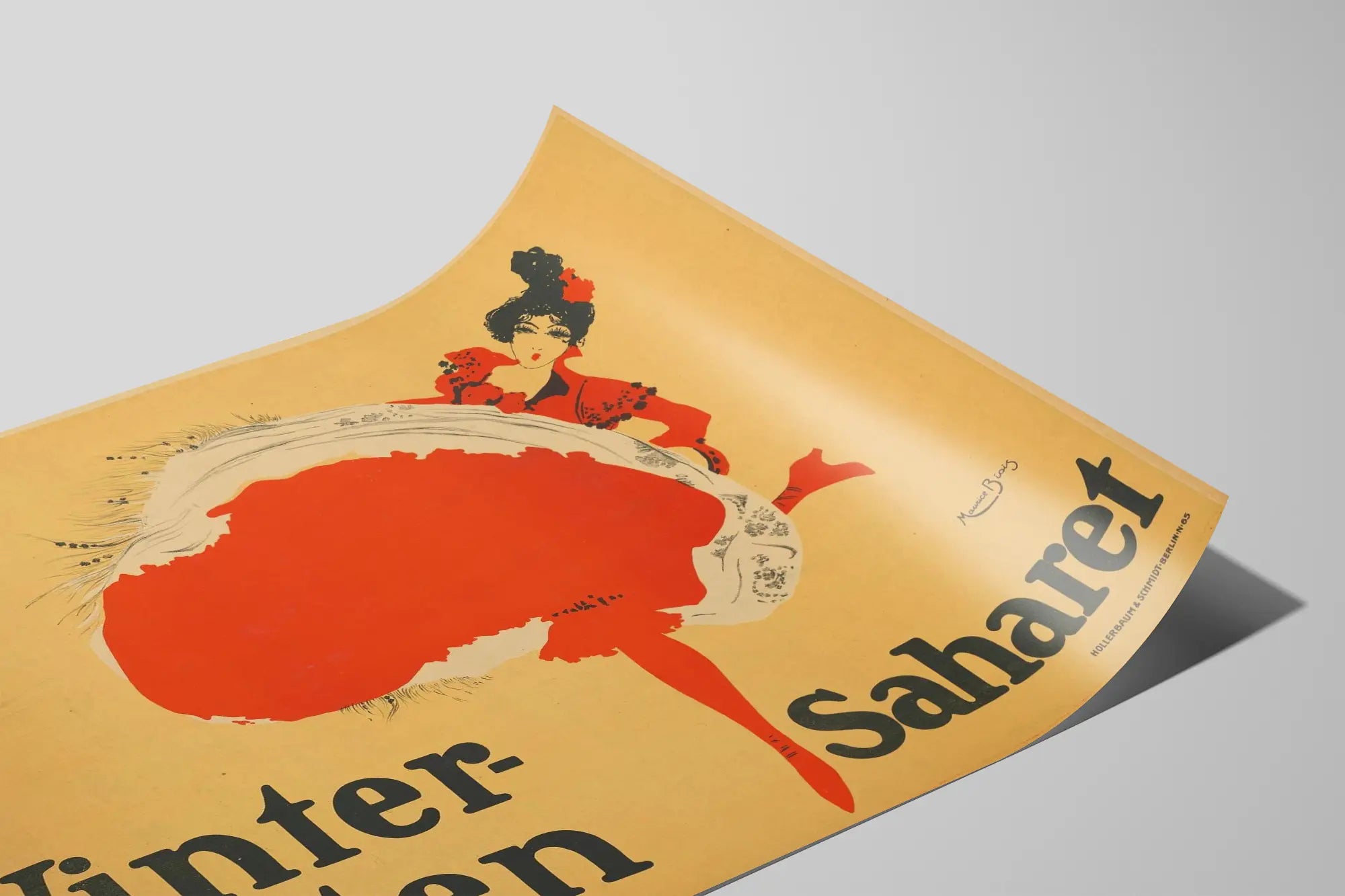 Dieses Vintage-Poster Winter-Garten Saharet ist ein ikonisches Wanddekorationselement, das durch seinen eleganten grafischen Stil und seine lebendigen Farben besticht. Auf einem sanften beigen Hintergrund zeigt die Zeichnung eine elegante Tänzerin in einem intensiven roten Kleid, deren Bewegung mit Flüssigkeit und Dynamik eingefangen wird. Die Komposition zeichnet sich durch den starken Kontrast zwischen dem leuchtenden Rot des Rocks und dem tiefschwarzen Schriftzug sowie den dekorativen Details aus. Die fette, schwarze Schrift hebt den Namen „Winter-Garten“ und „Saharet“ hervor und schafft eine perfekte visuelle Balance mit der Illustration. Dieses Retro-Poster kann jedem Raum einen künstlerischen und nostalgischen Akzent verleihen, egal in welchem Raum es aufgehängt wird. Als Wandposter verwendet, passt diese Wanddekoration sowohl in ein modernes Wohnzimmer, ein Schlafzimmer, ein Büro als auch in einen Bereich für Kunst oder Vintage-Design. Ihre grafische Schlichtheit und die Kraft der Farben ermöglichen es, jede Atmosphäre aufzuwerten, ohne den Raum zu überladen. Dieses auf hochwertigem Papier gedruckte Bild ist ein Klassiker des historischen Plakatdesigns und besticht durch seinen zeitlosen Charme. Ob Sie Kunstliebhaber, stilisierte Tänzerinnen oder Retro-Wanddekorationen sind – dieses Poster ist eine ideale Wahl, um Ihre Wände zu verschönern. Dieses Winter-Garten Saharet-Poster erweist sich auch als ausgezeichnete Wahl für Sammler von Werbekunst oder Liebhaber alter Plakate. Es verkörpert einen sofort erkennbaren künstlerischen Stil, der besonders für seine ausgewogene Ästhetik und seine beeindruckende visuelle Wirkung geschätzt wird. Als Dekoration kann es nach Ihren Wünschen gerahmt werden, um einen attraktiven Blickfang in Ihrem Raum zu schaffen. Dieses Vintage-Poster harmoniert wunderbar mit anderen dekorativen Elementen in neutralen Tönen oder warmen Farben und vervollständigt so eine einladende und elegante Atmosphäre. Dieses Winter-Garten Saharet-Poster zu wählen bedeutet, ein grafisches Werk in Ihre Wanddekoration zu integrieren, das eine starke visuelle Geschichte erzählt, inspiriert von den Shows und lebendigen Künsten vergangener Zeiten. Es ist auch eine originelle Möglichkeit, Ihr Interieur mit einer künstlerischen Note voller Charakter zu personalisieren.