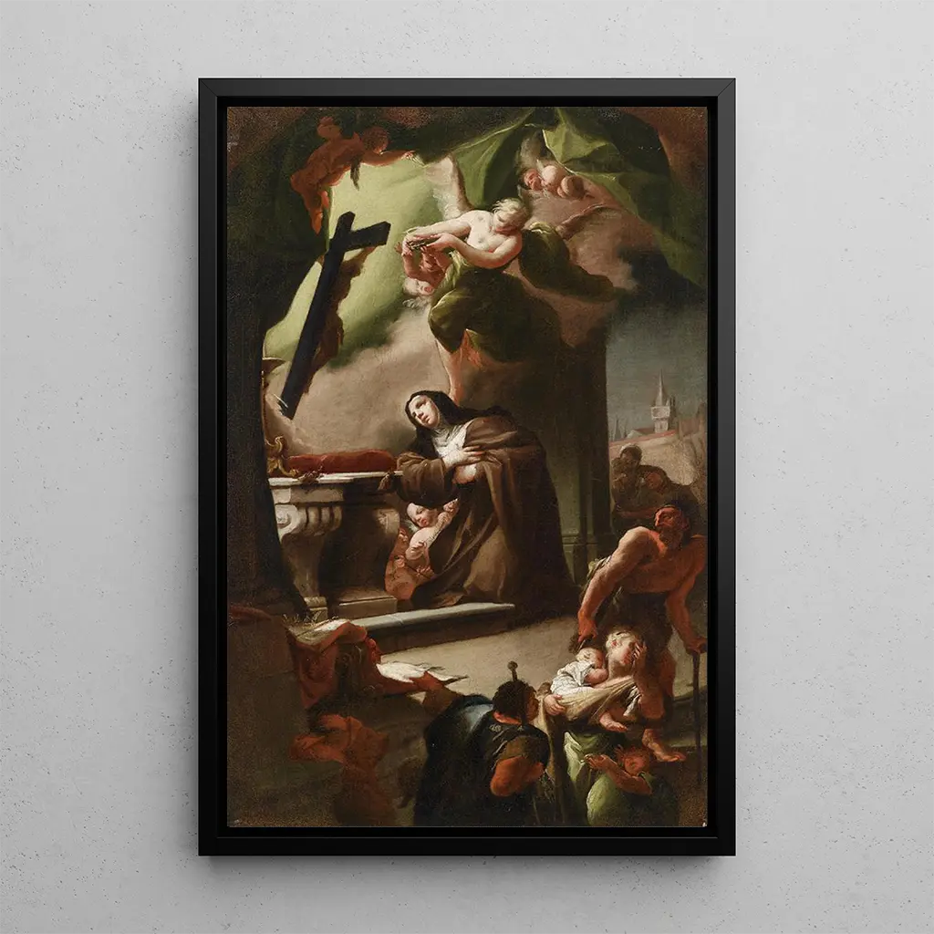 Die kunstdruck der Leinwand "Vision von Elisabeth" von Paul Troger entführt uns in ein mystisches Universum, in dem Licht und Schatten sich verweben, um eine sowohl ruhige als auch fesselnde Atmosphäre zu schaffen. Die zarten Farben, die von Pastelltönen bis zu tieferen Nuancen reichen, wecken ein Gefühl inneren Friedens. Die Technik des Künstlers, die Chiaroscuro und Realismus verbindet, erweckt die Figur der Elisabeth zum Leben, die fast greifbar aus der Leinwand zu treten scheint. Dieses Werk lädt zur Kontemplation ein und bietet einen Moment der Reflexion über Spiritualität und Glauben.
