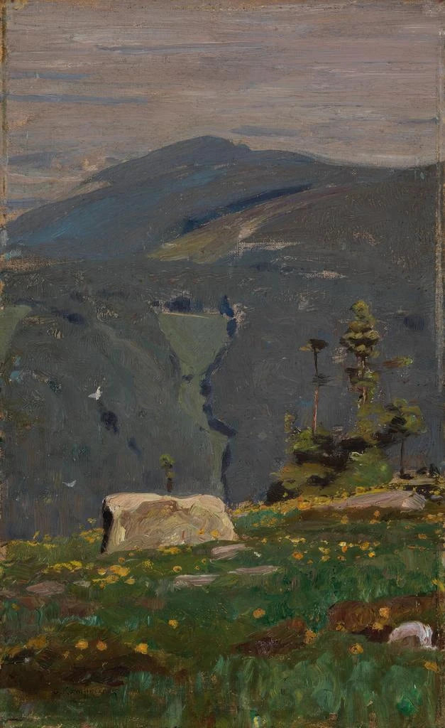 Das Gemälde "Blick von der Hornisgrinde" von Gustav Kampmann entführt uns in eine bergige Landschaft voller Ruhe. Die Nuancen von Grün und Blau verschmelzen harmonisch und erinnern an die Frische der Gipfel und die Tiefe der Täler. Die Technik von Kampmann, die Präzision und Impressionismus verbindet, schafft eine Atmosphäre der Ruhe und Kontemplation. Die detaillierten Darstellungen der Bäume und Wolken, verbunden mit weichem Licht, laden den Betrachter ein, in dieser unberührten Natur zu verweilen. Jeder Pinselstrich scheint die Essenz der reinen Bergluft einzufangen und bietet ein beruhigendes visuelles Erlebnis.