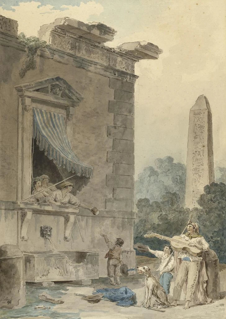 In diesem fesselnden Werk taucht Hubert Robert uns in eine Welt ein, in der Wohlwollen und Nächstenliebe lebendig werden. Die Damen, elegant gekleidet, kümmern sich um junge Kinder und schaffen eine warme und einladende Atmosphäre. Die sanften und leuchtenden Farben, verbunden mit einer zarten Maltechnik, verleihen der Szene eine fast ätherische Leichtigkeit. Die harmonische Komposition, mit ihren fließenden Linien und feinen Details, lädt den Betrachter ein, in diesen Moment des Teilens und Mitgefühls einzutauchen. Dieses Gemälde, eine wahre Ode an die Großzügigkeit, klingt mit einer emotionalen Tiefe, die die Zeit überdauert.