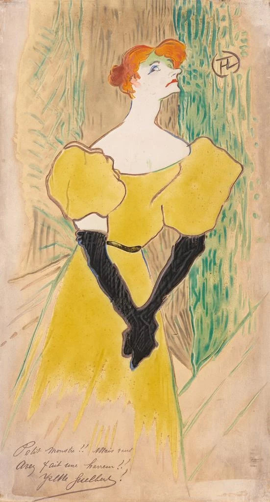 In diesem fesselnden Werk verewigt Henri de Toulouse-Lautrec Yvette Guilbert, die berühmte Kabarett-Sängerin, in einer Pose, die sowohl elegant als auch ausdrucksstark ist. Das Kunstwerk "Yvette Guilbert" zeichnet sich durch seine mutige Verwendung von Farben und Formen aus, die die lebendige Persönlichkeit der Künstlerin hervorheben. Die leuchtenden Töne und die betonten Konturen schaffen eine dynamische Atmosphäre, während der intensive Blick Guilberts die Aufmerksamkeit auf sich zieht. Toulouse-Lautrec gelingt es mit seiner Meisterschaft in grafischen Techniken, nicht nur das äußere Erscheinungsbild seines Modells einzufangen, sondern auch die Energie und das Charisma, die von ihr ausgehen, was dieses Werk wirklich lebendig macht.