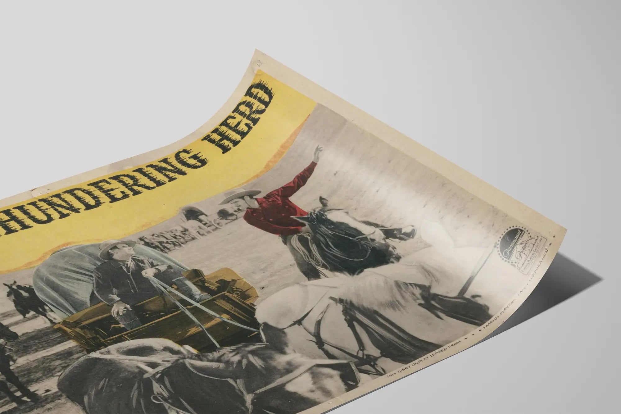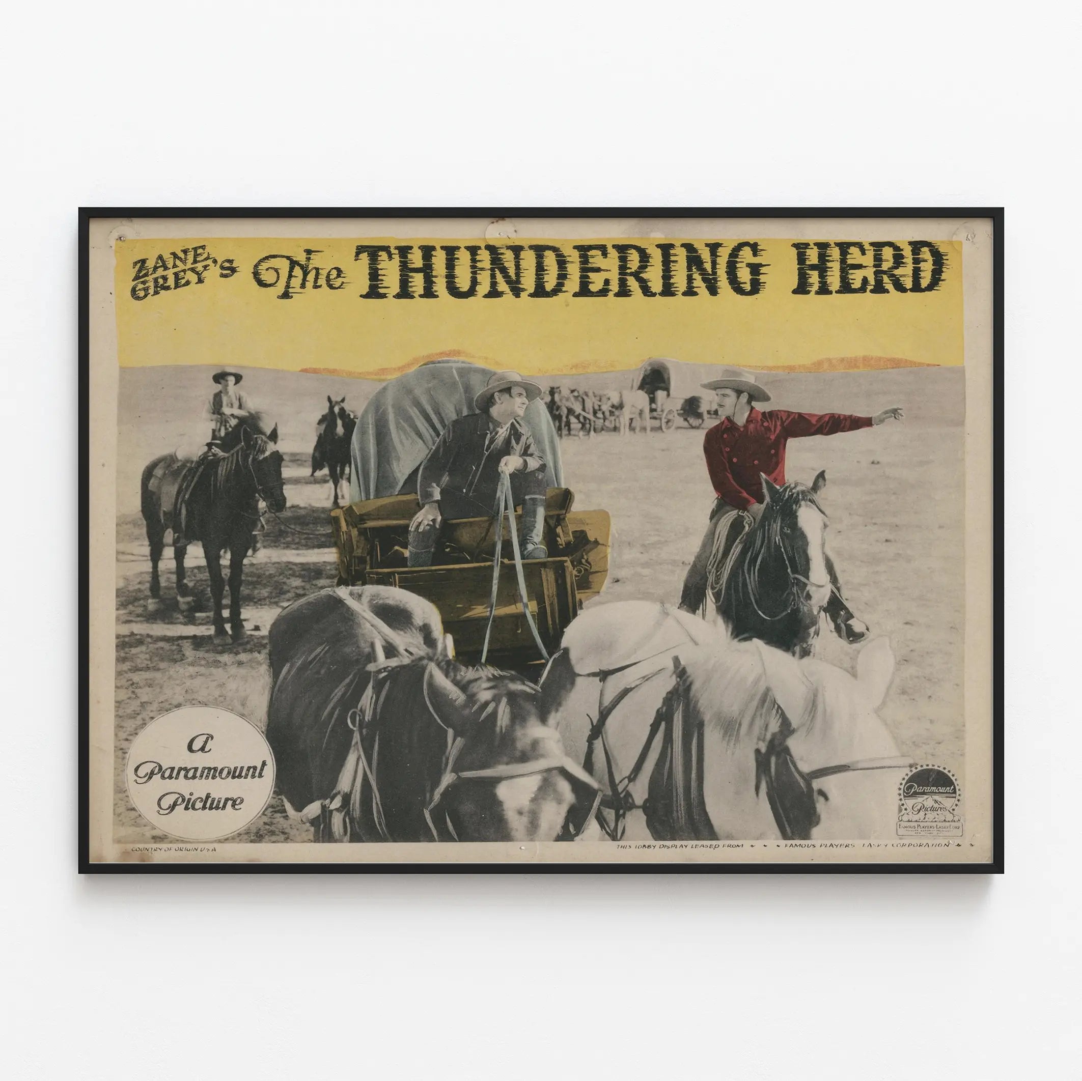 Dieses Vintage-Poster mit dem Titel „The Thundering Herd“ ist eine Wanddekoration, die die Welt des amerikanischen Wilden Westens evoziert. Im Stil klassischer Kinoplakate gestaltet, zeigt es zwei Cowboys inmitten einer Wüstenlandschaft mit Pferden und einem von einem Gespann gezogenen Wagen. Der grafische Stil verbindet dezente Farben mit einem gelben Hintergrund oben auf dem Poster, auf dem der Titel in Großbuchstaben in retro Typografie geschrieben ist, die den Western-Geist unterstreicht. Dieses Wandposter ist perfekt, um eine Vintage-inspirierte Inneneinrichtung zu bereichern oder für Liebhaber von Objekten, die an den klassischen Film und die Pionierzeit erinnern. Es verleiht eine authentische Atmosphäre der Eroberung des Westens, ideal, um ein Wohnzimmer, Büro oder einen Raum im Western-Stil individuell zu gestalten. Die grafische Komposition dieses Werkes bietet ein Gleichgewicht zwischen Modernität und Nostalgie, fängt einen Moment voller Action und Abenteuer ein und bewahrt gleichzeitig eine elegante und eindrucksvolle Dekorationswirkung. Dieses Poster passt perfekt in eine Sammlung von Retro-Postern, kann so aufgehängt oder gerahmt werden, wie es den eigenen Vorlieben entspricht. Es ist ein markantes Stück für jeden Liebhaber thematischer Wanddekorationen, das einen einzigartigen Charme und eine Geschichte voller Bedeutung vermittelt. Seine Präsenz an der Wand zieht sofort die Aufmerksamkeit auf sich und weckt Neugier durch seinen ausdrucksstarken Stil und seine zeitlose Atmosphäre.