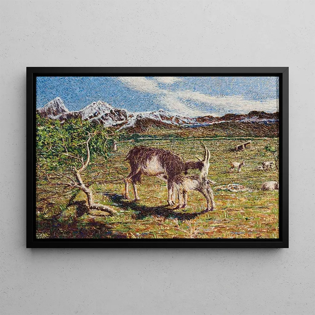 Chèvres contre paysage : eine harmonie zwischen natur und gelassenheit Dieses werk von Giovanni Segantini, "Chèvres contre paysage", erinnert an eine idyllische szene, in der die ruhe herrscht. Die ziegen, zentrale figuren der komposition, heben sich vor einem hintergrund aus majestätischen bergen und grünen wiesen ab. Die farbpalette, dominiert von sanften grüntönen und goldenen lichtakzenten, schafft eine beruhigende und kontemplative atmosphäre. Die technik von Segantini, die impressionismus und symbolismus verbindet, lädt den betrachter ein, in die schönheit der natur einzutauchen und eine tiefe verbindung zu den tieren zu spüren, die sie bewohnen. Giovanni Segantini : ein meister der alpenlandschaft Giovanni Segantini, geboren 1858 in Italien, ist eine ikonische figur der symbolistischen und impressionistischen bewegung. Beeinflusst von der schönheit der alpenlandschaften, konnte er licht und emotionen in seinen werken einfangen. Seine produktivste phase liegt gegen ende des 19. jahrhunderts, in der er einen einzigartigen stil entwickelte, gekennzeichnet durch lebendige farben und harmonische kompositionen. Segantini wurde auch von philosophien der natur und spiritualität beeinflusst, was sich in seinen gemälden widerspiegelt. "Chèvres contre paysage" ist ein perfektes beispiel seines künstlerischen erbes, das das landleben und die schönheit der alpen feiert. Eine dekorative anschaffung mit vielfältigen vorteilen Die kunstdruck von "Chèvres contre paysage" ist ein ideales dekoratives stück, um einen touch natur in ihr zuhause zu bringen. Ob im wohnzimmer, büro oder schlafzimmer, dieses bild vermittelt gelassenheit und frieden und schafft eine entspannende atmosphäre. Die qualität des kunstdrucks garantiert eine bemerkenswerte treue zu den farben und details des originalwerks, sodass man das talent von Segantini voll und ganz genießen kann. Mit seiner ästhetischen anziehungskraft wird diese leinwand kunstliebhaber und landschaftsfreunde begeistern und gleichzeitig ihre inneneinrichtung bereichern.