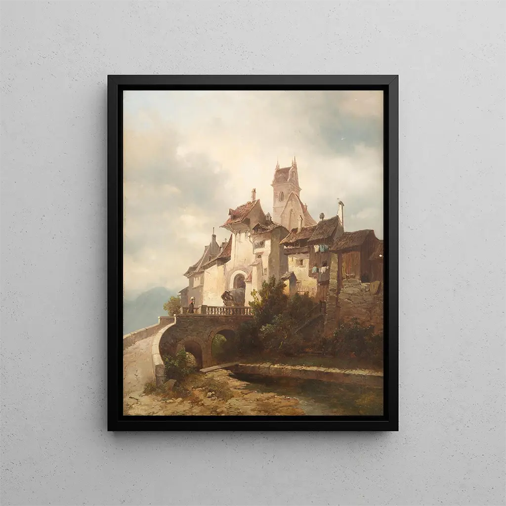 Reproduktion Stadtbild - Adolf Gustav Thamm – Einführung, die fasziniert Das "Stadtbild" von Adolf Gustav Thamm ist ein Werk, das den Betrachter in eine bezaubernde Welt entführt, in der gotische Architektur und idyllische Landschaften harmonisch aufeinandertreffen. Dieses ikonische Stück lädt zu einer Reise in vergangene Zeiten ein, die Geheimnisse und die Größe früherer Städte hervorrufen. Durch diesen Kunstdruck gelingt es dem Künstler, die Essenz des mittelalterlichen Lebens einzufangen und einen Blick auf eine Epoche zu gewähren, in der jeder Stein eine Geschichte erzählte und jede Gasse von Legenden durchdrungen war. Dieses Gemälde wird somit zu einem visuellen Zeugnis, einer Einladung zum Träumen und zur Kontemplation. Stil und Einzigartigkeit des Werks Der Stil von Thamm zeichnet sich durch seine sorgfältige Herangehensweise und seine Fähigkeit aus, eine spürbare Atmosphäre in seinen Kompositionen zu schaffen. In "Stadtbild" sind die architektonischen Details mit bemerkenswerter Präzision wiedergegeben, wobei majestätische Gebäude mit filigranen Skulpturen und bunten Glasfenstern hervorgehoben werden. Die Farbpalette des Künstlers, die zwischen erdigen Tönen und leuchtenden Akzenten schwankt, schafft einen beeindruckenden Kontrast, der den Blick anzieht und die Fantasie anregt. Der Einsatz von Licht, subtil moduliert, erweckt die Szene zum Leben, erinnert an tanzende Schatten der Fackeln und das sanfte Leuchten der Öllampen. Jedes Element dieses Werks trägt zu einer nostalgischen Stimmung bei, in der der Betrachter fast die Flüstertöne der Passanten und die Echos der Kirchenglocken hören kann. Der Künstler und sein Einfluss Adolf Gustav Thamm, obwohl weniger bekannt als einige seiner Zeitgenossen, hat eine unauslöschliche Spur in der Welt der Kunst hinterlassen, dank seiner einzigartigen Vision und technischen Meisterschaft. In einem künstlerischen Umfeld aufgewachsen, ließ sich Thamm von den Meistern der Vergangenheit inspirieren und entwickelte einen eigenen Stil. Sein Werk zeichnet sich durch eine starke Verbindung zur Geschichte aus, und sein Interesse an mittelalterlicher Architektur führte ihn dazu, Themen zu erforschen, die von seinen Zeitgenossen oft vernachlässigt wurden. Durch die Integration historischer Elemente in seine Kreationen bereicherte er nicht nur die künstlerische Landschaft seiner Epoche, sondern ebnete auch den Weg für eine Wiederentdeckung der ästhetischen Werte vergangener Jahrhunderte. So bleibt sein Einfluss bestehen und inspiriert zahlreiche zeitgenössische Künstler, die Wurzeln ihrer eigenen Kunst neu zu entdecken. Eine außergewöhnliche Wanddekoration signiert von Artem Legrand Der Kunstdruck von "Stadtbild - Adolf Gustav Thamm" ist viel mehr als nur eine Wanddekoration. Er stellt ein Meisterwerk dar, das jeden Raum aufwertet, sei es ein Wohnzimmer, eine Bibliothek oder ein Büro. Signiert von Artem Legrand, wurde dieses Werk mit größter Liebe zum Detail und unübertroffener Handwerksqualität gefertigt.