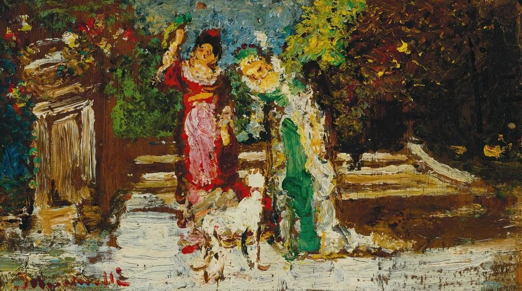 Die reproduction von Zwei Frauen und Hund von Adolphe Monticelli entführt uns in einen Moment der Zärtlichkeit und Verbundenheit. Die lebendigen Farben und die dynamischen Pinselstriche schaffen eine lebendige Atmosphäre, in der die Figuren unter unseren Augen zu leben scheinen. Das Gemälde strahlt eine spürbare Wärme aus, dank der geschickten Verwendung warmer Töne, die die Figuren umhüllen. Monticelli gelingt es mit seinem einzigartigen Stil, das Wesen des Alltags einzufangen und dabei eine Prise Poesie und Traumhaftigkeit hinzuzufügen.