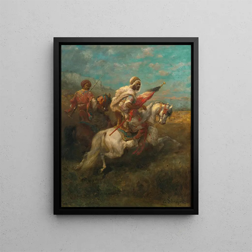 Reproduktion Zwei Reiter zu Pferd - Adolf Schreyer – Faszinierende Einführung Das Gemälde "Zwei Reiter zu Pferd" von Adolf Schreyer ist ein faszinierendes Werk, das den Betrachter in eine Welt entführt, in der die wilde Natur auf den Heroismus der Reiter trifft. Dieses Werk, ein Symbol des romantischen Stroms, evoziert nicht nur die Schönheit der Landschaft, sondern auch den Mut der Figuren, die sie bewohnen. Durch eine dynamische Komposition und eine reiche Farbpalette gelingt es Schreyer, die Essenz von Abenteuer und Erkundung einzufangen und jeden dazu einzuladen, sich an die Seite dieser Reiter auf einer epischen Suche zu versetzen. Stil und Einzigartigkeit des Werks Der Stil von Schreyer zeichnet sich durch seine akribische Detailgenauigkeit und meisterhafte Nutzung des Lichts aus. In "Zwei Reiter zu Pferd" scheint jeder Pinselstrich voller Emotionen zu sein, der die Tiefe der Figuren offenbart und gleichzeitig die Majestät der umgebenden Landschaft hervorhebt. Die Pferde, anatomisch präzise dargestellt, zeugen von der Liebe des Künstlers zur Welt der Pferde und seinem Engagement, die Kraft und Anmut dieser Tiere zu ehren. Die Gegenüberstellung der Reiter vor einer Kulisse aus großartigen Bergen und dramatischen Himmeln schafft eine visuelle Spannung, die sofort das Auge des Betrachters fängt. Die Grüntöne, Blau- und Erdtöne, die Schreyer verwendet, vermitteln eine Atmosphäre, die sowohl ruhig als auch wild ist, und verstärken das Gefühl der Flucht, das dieses Werk vermittelt. Der Künstler und sein Einfluss Adolf Schreyer, geboren 1828, gilt als einer der Meister der Landschafts- und Pferdeszenenmalerei des 19. Jahrhunderts. Vom romantischen Bewegung beeinflusst, verstand er es, seine Liebe zur Natur mit einer realistischen Darstellung der Figuren zu verbinden. Sein Werk ist geprägt von tiefem Respekt vor dem Sujet, sei es die Majestät der Pferde oder die Größe der Landschaften. Schreyer war auch ein Pionier in der Darstellung alltäglicher Szenen und suchte, Momente von Mut und Heroismus zu verewigen. Sein Einfluss auf die Kunstszene ist unbestreitbar, da er viele zeitgenössische Künstler inspirierte, die Verbindung zwischen Mensch und Natur zu erforschen. Die Reproduktion "Zwei Reiter zu Pferd - Adolf Schreyer" spiegelt diesen nachhaltigen Einfluss wider und zeigt die Fähigkeit der Kunst, zeitlose Momente einzufangen. Eine außergewöhnliche Wanddekoration signiert von Artem Legrand Eine Reproduktion von "Zwei Reiter zu Pferd" von Adolf Schreyer zu wählen, bedeutet, ein Stück zu wählen, das den einfachen Dekorationszweck übertrifft und zu einem echten Kunstwerk wird, das die Atmosphäre jedes Raumes hebt. Signiert von Artem Legrand, ist diese Reproduktion eine Hommage an die raffinierte Ästhetik und das künstlerische Erbe von Schreyer. Jedes Detail ist sorgfältig wiedergegeben, sodass Liebhaber