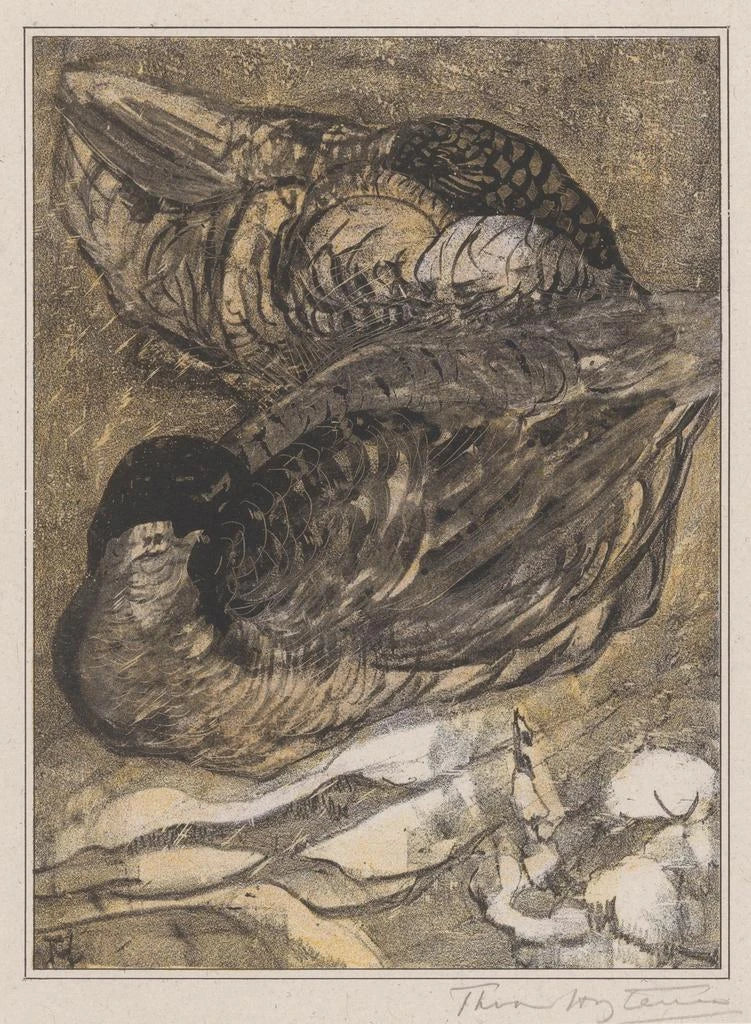 In diesem zarten Werk fängt Theo van Hoytema die Essenz der Ruhe mit seinen zwei ruhenden Enten ein. Die Komposition ist harmonisch, wobei die sanften Töne von Grün und Blau sich vermischen, um ein Gefühl von Frieden zu vermitteln. Die Aquarelltechnik, mit ihren fließenden Nuancen, erweckt die Szene zum Leben und bewahrt gleichzeitig eine träumerische Atmosphäre. Die Enten, friedlich auf dem Wasser sitzend, scheinen in einer eigenen Welt zu schweben und laden den Betrachter ein, innezuhalten und diesen flüchtigen Moment der Natur zu bewundern.