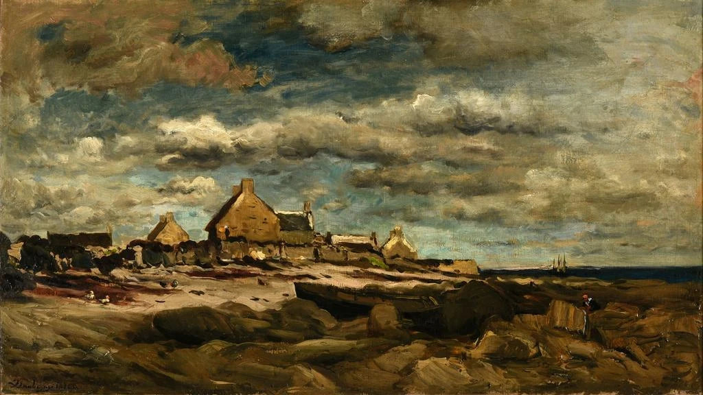 Das Werk "Entre de Krity" von Charles François Daubigny lädt zu einer tiefen Betrachtung der idyllischen Landschaften ein. Das Leinwandbild, von Licht durchflutet, offenbart eine Palette sanfter und natürlicher Farben, in der üppiges Grün mit den Blautönen des Himmels verschmilzt. Die impressionistische Technik, charakteristisch für Daubigny, zeigt sich durch fließende und expressive Pinselstriche, die eine ruhige und poetische Atmosphäre schaffen. Die Figuren, gut in die Szenerie integriert, scheinen in Symbiose mit der umgebenden Natur zu leben, was die Idee einer Harmonie zwischen Mensch und Umwelt verstärkt.